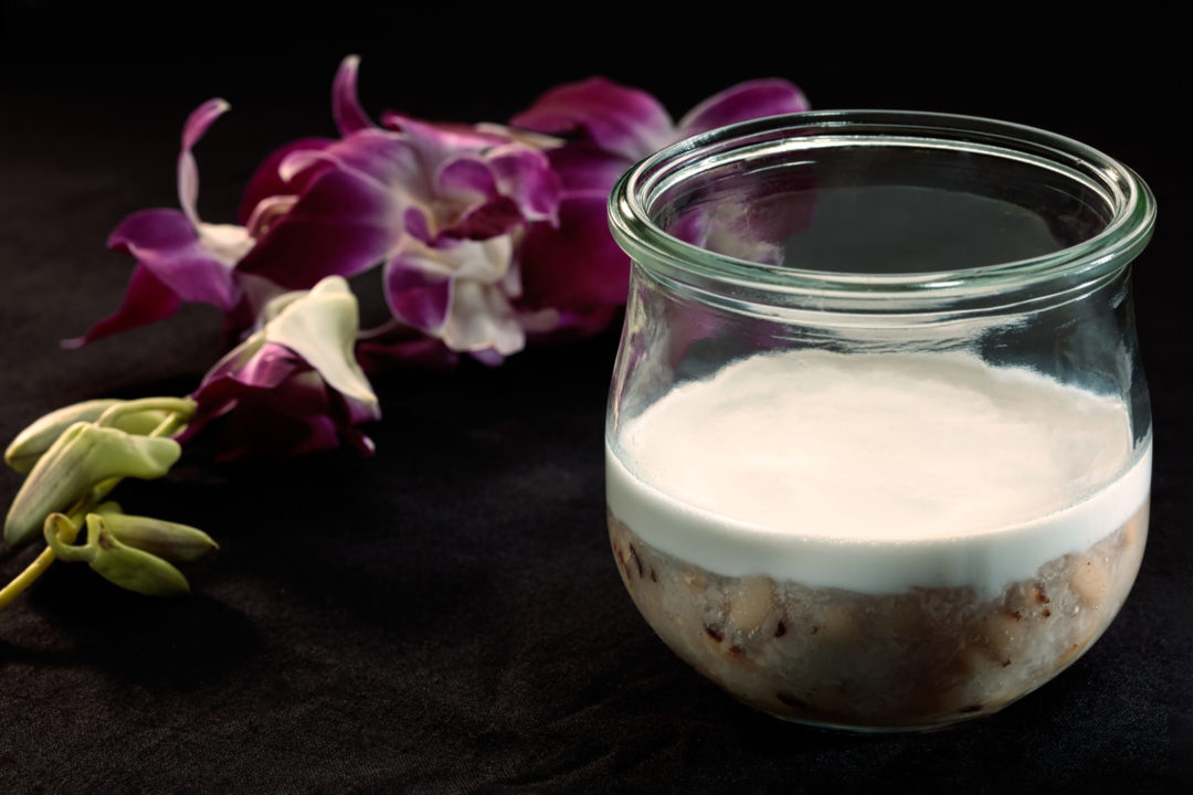 Banane au lait de coco, perles de tapioca et arachides grillées.