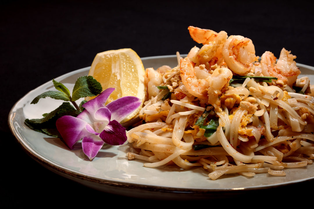 Pâtes de riz sautées au wok avec crevettes, tofu, œuf, cacahuètes grillées et citron vert. Possible en végétarien.