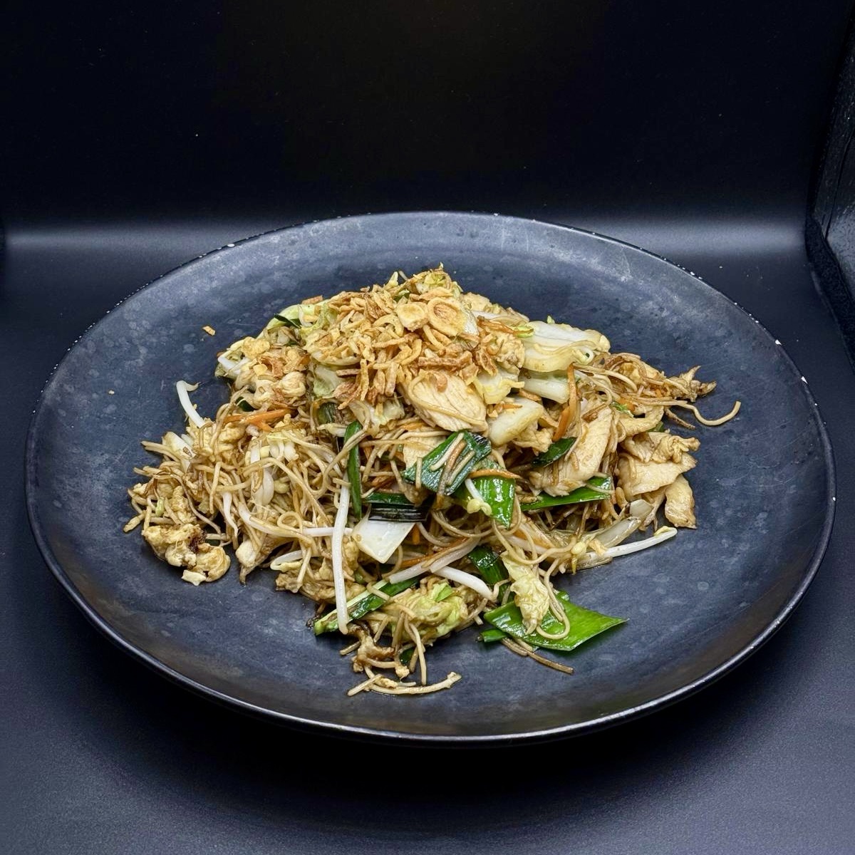 Nouilles de blé sautées avec poulet tendre, légumes de saison et touche de soja.